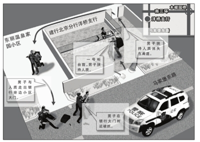一號柜臺是一名男業(yè)務(wù)員,表現(xiàn)得比較冷靜。業(yè)務(wù)員邊勸其冷靜,邊將一沓沓百元人民幣推到窗外,整個(gè)動(dòng)作很緩慢。劫匪情緒激動(dòng),一直在催促動(dòng)作快些。幾分鐘后,劫匪顯然失去耐性,將已經(jīng)拿出的現(xiàn)金裝到黑色背包中。據(jù)警方事后發(fā)布,被裝進(jìn)背包的現(xiàn)金共14萬元。劫匪勒著喬女士的脖子向大廳內(nèi)側(cè)的通道走去。其間,喬女士在不停叫喊,這時(shí)門口的人才看到,在劫匪的左手上還有一把刀架在喬女士脖子上,右手黑色手槍卻沒有指著人質(zhì),帶著人質(zhì)消失在甬道內(nèi)。