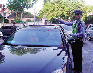 前天傍晚6點多,南京交警五大隊民警喻何鑫正在北京西路西康路路口值勤,這時電臺突然響了,在云南路執(zhí)勤的同事告訴他,剛剛有一輛黑色轎車駛過,從天窗中伸出一根桿子,上面還掛著一個塑料袋。同事讓他攔下檢查一下,于是小喻就在路口等待。很快,一輛黑色轎車駛來,小喻定睛一看,就是同事說的那輛車。再仔細(xì)辨認(rèn),小喻嚇了一跳,原來這伸出天窗的居然是一根掛水桿,上面還有輸液袋。難道是車主一邊掛水一邊開車,小喻趕緊上前將該車攔下,靠邊停車后,他才發(fā)現(xiàn)是坐在副駕上的女子在掛水!熬尤荒苓@樣掛水,真是神奇”,“看來天窗也有好處啊,桿子伸出來方便!甭愤^市民看到這一“奇景”后紛紛駐足議論。