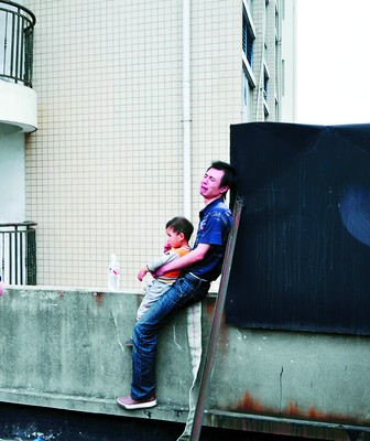 昨日下午4時(shí)20分左右,在郴州市西街一樓房的頂層,一名男子抱著自己3歲的小孩,吵著要從上面跳下來。