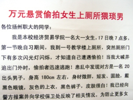 18日,一張張名為《萬(wàn)元懸賞偷拍女生上廁所的猥瑣男》的“懸賞啟事”,張貼在了揚(yáng)州職業(yè)大學(xué)校園內(nèi),吸引了該校師生的注意。記者看到,“懸賞啟事”標(biāo)題的字體和顏色都格外醒目,內(nèi)容為一位大一女生遭遇偷拍的經(jīng)歷。“我是本校經(jīng)濟(jì)貿(mào)易學(xué)院一名大一女生,17日晚7點(diǎn)多,第一節(jié)晚自習(xí)期間,我到一號(hào)教學(xué)樓上廁所,突然廁所門下有多次閃光燈閃爍,才知道自己遭遇偷拍!……我已經(jīng)向警方報(bào)案并向?qū)W校保衛(wèi)處反映了相關(guān)情況。為防止更多女生受侵害,早日將這種性變態(tài)的人繩之以法,我個(gè)人出10000元懸賞知情人提供有價(jià)值線索!庇浾咦⒁獾,“10000元”的字體很大,而且是紅顏色,格外惹眼。啟事最后還寫著“捍衛(wèi)女生權(quán)益,和偷拍斗爭(zhēng)到底”的字樣。