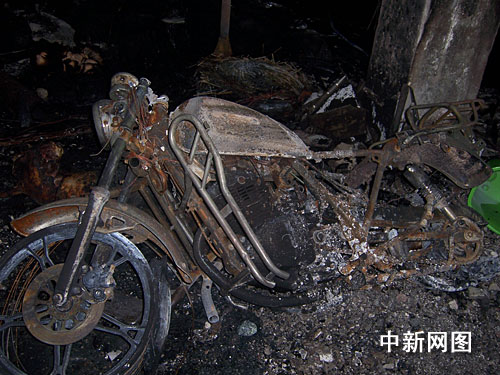 在一樓火災(zāi)事故現(xiàn)場,記者看到房屋已被燒得漆黑一片,中間部位堆放的一些輔料和半成品全部過火,靠墻的一邊有一輛被燒毀的摩托車。輔料被燒后產(chǎn)生的大量濃煙將墻壁熏得灰黑。