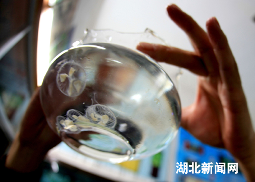 21日下午,丹江口市新港村村民陳文新在漢江河畔,猛然發(fā)現(xiàn)發(fā)現(xiàn)水中有一些通體晶瑩透亮的生物,在水中伸縮漂游,附近約有4000余只。后經(jīng)該市水產(chǎn)局副局長(zhǎng)、水產(chǎn)工程師熊治邦現(xiàn)場(chǎng)鑒定,這些水生生物是世界最高級(jí)別的“極危生物”---桃花水母。
