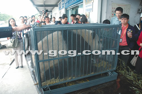 上午9點30分,迎接樂水和珠珠的車隊終于得以離開機場,經(jīng)過市區(qū)巡游后于11點40分來到貴陽扎佐森林野生動物園。此時,動物園門前的廣場上已聚集了四五百人。