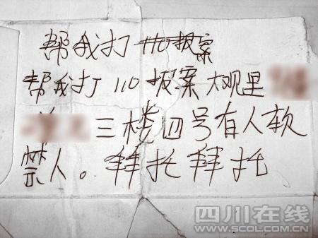 “幫我打110報案……有人軟禁人,拜托拜托。”昨日下午2點,家住成都大觀里某小區(qū)的一位大爺正在小區(qū)內(nèi)散步,突然,一張硬紙條歪歪扭扭地從三樓窗戶飄落下來,大爺拾起一看,大吃一驚,立即將紙條交給小區(qū)門衛(wèi)。5名警察接警后立即出動……