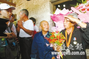 "回家了,我終于在自己的有生之年回家了……"昨日下午,當(dāng)胸掛抗日紀(jì)念獎(jiǎng)?wù)碌?8歲川籍遠(yuǎn)征軍老兵劉召回,下車后邁出右腳,踏上四川省岳池縣裕民鎮(zhèn)的故土?xí)r,禁不住老淚縱橫——這一刻,他已等了整整67年!
