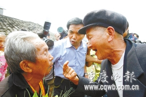 “劉東娃(劉召回的小名),讓我摸摸你頭頂?shù)膫,好沒有?”只見一位年齡相仿的老人擠進(jìn)人群,將雙手罩向了劉的后腦,撥開層層白發(fā),撫摸著一道一寸來長(zhǎng)的疤痕驚喜地說,“沒錯(cuò),就是東娃!你頭上這道傷疤,是我們一起下河摸魚時(shí)摔傷的,你還記得不?”