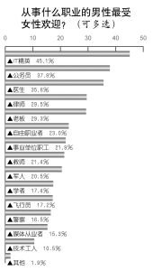 如今,從事什么職業(yè)的男性最受女性歡迎?調查中選出的十大職業(yè)為:IT精英(45.1%)、公務員(37.9%)、醫(yī)生(35.6%)、律師(29.5%)、老板(29.3%)、自由職業(yè)者(23%)、事業(yè)單位職工(21.9%)、教師(21.4%)、軍人(20.5%)、學者(17.4%)。