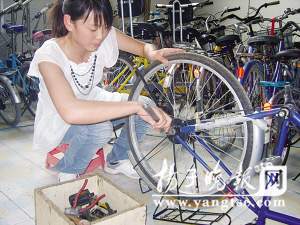 在無錫商業(yè)職業(yè)技術學院創(chuàng)業(yè)教育園里面有一家“奇·騎車行”,主營自行車租賃和維修,在整個藕塘職教園區(qū)都很有知名度。讓人想不到的是,這家車行的“主人”竟然是一名23歲的在校女大學生,一位自行車的維修高手。昨天,記者在學校里見到了這位來自連云港的大三女孩姚莉娟。小姚給人的第一印象就是身材高挑,漂亮大方,大學生美女這些詞匯怎么也和修車掛不上關系。自從愛上修車之后,她整天和油污、機械打交道,靠著自己的勤勞和智慧,被大家稱為大學里的最美“修車匠”。