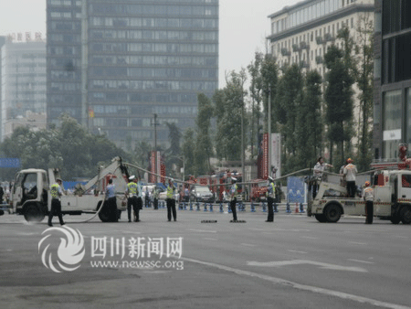 記者在現(xiàn)場(chǎng)未見(jiàn)到救護(hù)車(chē)輛,F(xiàn)場(chǎng)有近10輛消防車(chē),交警正在疏導(dǎo)交通,成都主干道人民南路二段交通并未中斷。