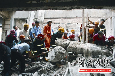 9時50分,湘潭市雨湖、特勤兩個消防中隊火速趕赴現(xiàn)場,當(dāng)時已有一名被困者被成功救出,另有一名民工的下半身被死死壓住,動彈不得;其上半身被砸得遍體鱗傷,胸口正好卡在斷裂的房梁下,血流不止。