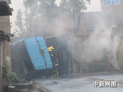 消防隊(duì)員趕到現(xiàn)場(chǎng)時(shí),只見(jiàn)一輛槽罐車(chē)側(cè)翻橫在村道中間,車(chē)頭部將右邊車(chē)道旁的兩間房子撞了兩個(gè)大窟窿,整個(gè)槽罐已脫離車(chē)身,躺在路邊水溝內(nèi),泄漏的硫酸不斷流入旁邊的水溝,冒出白色的煙霧,空氣中充滿(mǎn)了刺鼻的味道,幾百米外都能聞到。消防隊(duì)員在現(xiàn)場(chǎng),明顯感到喉嚨干澀,許多村民用毛巾、衣角捂住口鼻,退至安全地帶。