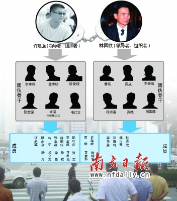 許建強(qiáng)為首成立了“閘坡鴻發(fā)水產(chǎn)品購(gòu)銷部”等一系列公司,以暴力、脅迫等手段實(shí)施故意殺人、故意傷害、敲詐勒索、強(qiáng)迫交易和非法收取保護(hù)費(fèi)等違法犯罪行為,壟斷了陽(yáng)江部分地區(qū)的海鮮、冰條、螺仔、三鳥、沙石、煤氣、客運(yùn)、運(yùn)輸物流市場(chǎng)。林國(guó)欽為首則成立了信誠(chéng)寄賣行等一系列公司,同樣以暴力、脅迫手段實(shí)施了故意傷害、強(qiáng)迫交易、非法經(jīng)營(yíng)等違法犯罪活動(dòng),基本壟斷了陽(yáng)江的水泥銷售市場(chǎng),在追收非法債務(wù)過程中,逼迫他人以山林、廠房抵債,大肆掠奪他人或企業(yè)財(cái)產(chǎn),甚至導(dǎo)致有的企業(yè)破產(chǎn)倒閉。陽(yáng)江地區(qū)的社會(huì)穩(wěn)定及經(jīng)濟(jì)發(fā)展受到了嚴(yán)重影響。