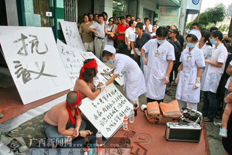 6月16日下午4時許,網(wǎng)友“馬甲00007”在廣西新聞網(wǎng)紅豆社區(qū)上發(fā)了題為“猛報:赤膊靜坐抗議城管(多圖)”的帖子,引起眾多網(wǎng)友的關(guān)注。記者在第一時間趕到南寧市思賢路的一家戶外用品店鋪。