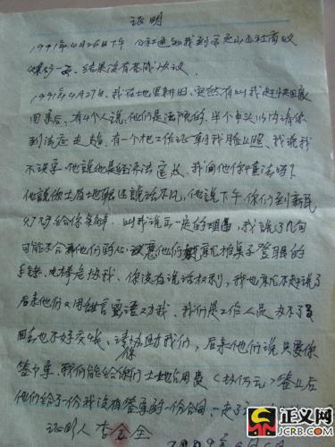 但事情到后來卻發(fā)生了變化——6月13日,再次來京的兩位舉報者帶來了李金全,李金全說:記者采訪時,自己介紹的其他情況都是真實的,但簽字一事沒有講真話。在調(diào)解書上,自己是簽了字的。以前,記者采訪時在這個問題上之所以沒有說實話,一是擔(dān)心承認(rèn)自己當(dāng)初經(jīng)不起法官的威脅和引誘,在損害集體利益的調(diào)解書上簽過字,村民們會瞧不起他這種軟骨頭。二是怕記者不敢碰硬揭露本案的內(nèi)幕,想以否定自己簽字的假情況引起記者重視。但如今記者要發(fā)稿了,為了對事實負(fù)責(zé),所以愿意說出當(dāng)時的真實情況。