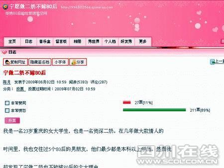 該QQ空間名為“寧愿做二奶不嫁80后”,一共只有兩篇日志:《本人真實(shí)個(gè)人資料》和《寧做二奶不嫁80后》,先后發(fā)表于6月2日10:55和10:59,前后相差4分鐘。相冊(cè)里僅有一張照片,即網(wǎng)帖里公布的那一張“本人真實(shí)照片”。