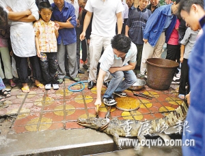 昨下午,綦江縣橋河社區(qū)陽光幼兒園旁的人行道。一條一米六七的鱷魚被兩小伙合力抓尾巴拖出鐵籠,一把鐵鉗夾住鱷魚頸,鐵錘敲頭、尖刀割喉……就這樣,本性兇殘的鱷魚在五六十人圍觀下,被殺死肢解,嚇得不少小朋友蒙眼,膽小的成人失聲尖叫。