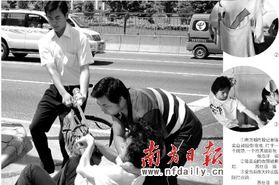 隨后,南方都市報(bào)攝影記者陳奕啟與管理員吵起來,推搡中管理員撕裂記者的衣服,并再出招“鎖喉功”。一名市場(chǎng)管理員一拳打中陳奕啟頭部,推搡中陳奕啟被推下人行道,然后又被按倒輪番連踢帶踹,其中一人雙手鎖住記者喉嚨,一人強(qiáng)行搶走攝影包。