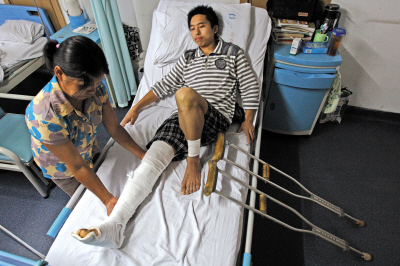 昨日下午,23歲的綦江男子楊傳華躺在重醫(yī)附一院骨科病床上,他的右腿打著夾板、纏著繃帶不能動彈。他說,7月2日早上,他在渝中區(qū)六店子小學(xué)旁邊的樹林里鍛煉,學(xué)校保安誤認(rèn)為他是兩天前騷擾學(xué)校女老師的男子,將其腿打斷。至今,學(xué)校和保安未支付一分治療費用,也沒有來看望和向楊道歉。