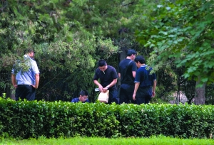 王明說(shuō),起初,藍(lán)衣男子出門后向東逃跑,跨進(jìn)了銀行旁的綠化帶,然后向南前行了幾步,隨即馬上轉(zhuǎn)身,沿反方向跑去。到達(dá)銀行對(duì)面的綠化帶時(shí),他和保安堵住了該男子。但藍(lán)衣男子沖著二人將瓶子里的無(wú)色液體灑出,隨后繞開他們,繼續(xù)向北跑去,很快就不見蹤影。