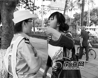 當(dāng)天下午4點(diǎn)45分,22歲女大學(xué)生小蕊走出銀龍影城橫穿6個車道后,在首力大廈被現(xiàn)場執(zhí)勤的?诮痪瘮r下。當(dāng)交警告知她,翻越護(hù)欄橫穿馬路屬于交通違法行為需接受處罰時,小蕊聲稱自己是第一次,身上也沒帶錢,隨后便開始“發(fā)飆”了!澳闼龐尩膞x,我x你媽!边@名女大學(xué)生開始對交警進(jìn)行辱罵。?谑薪痪ш犚幻(fù)責(zé)攝像的工作人員對這一過程進(jìn)行錄像時,女子一把抓過攝像機(jī)準(zhǔn)備砸在地上時,被交警及時制止,“你要是砸了錯就更大了”。