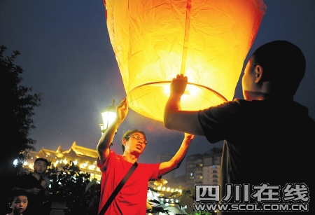 晚8點,合江亭邊天色還未全暗,“范跑跑”身著紅色T恤、休閑短褲和一群藝術(shù)家安靜地坐在竹椅上等候。8點30分左右,德籍華人藝術(shù)家蔡青招呼眾人,《祈愿》正式開始,范跑跑徑直走向安放孔明燈的紙箱旁!拔覀兊目酌鳠羰菑呐_北郵購過來的。除了要用孔明燈為地震逝者祈愿,還寓意海峽兩岸人對生命的尊敬。下面我和范老師將共同放飛孔明燈,愿意參與的市民都可以加入。”蔡青是此次活動的主要發(fā)起人,作為常年旅居國外的德籍華人藝術(shù)家,蔡青說多次前往映秀、北川等災區(qū),大片廢墟令他很震驚。蔡青點燃孔明燈后,邀請“范跑跑”和他共同扶住燈的底框,將高達1米左右的孔明燈逐個放飛。