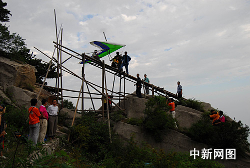 西岳華山,在全球華人的心中有著特殊的地位。金庸大師2003年10月登頂華山論劍,更使華山聲名遠(yuǎn)播。海拔2082米的華山西峰為華山五大主峰之一,一塊完整巨石,渾然天成,絕崖千丈,似刀削鋸截,其陡峭巍峨、陽剛挺拔之勢是華山山形之代表。一般從事滑翔運(yùn)動的愛好者自此飛躍而下并滑翔直線行程6公里。