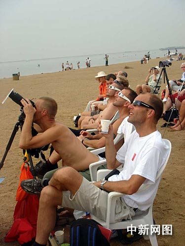 當(dāng)天早晨七點(diǎn)左右,記者來自上海市郊的金山城市沙灘。在這一被稱為本次日全食中國最佳觀測點(diǎn)之一的沙灘上已經(jīng)聚集了一千多名境外天文愛好者。據(jù)悉,此次“跨國追日”活動(dòng)是由上海、江蘇、云南三地的八家旅行社策劃組織的,成員分別來自美國、加拿大、意大利、西班牙、荷蘭、瑞典、丹麥、日本、泰國等國家。
