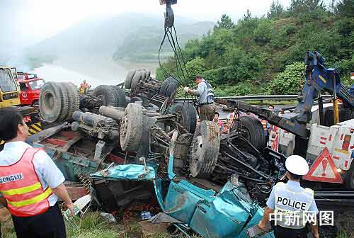 因大掛車四腳天,三名人員被死死的壓在了車內(nèi),而駕駛室已經(jīng)完全變形,消防官兵的救援器材根本派不上用途。指揮員馬上與現(xiàn)場(chǎng)的交警協(xié)商,利用交警大隊(duì)的大吊車將大掛車的車頭掉起。