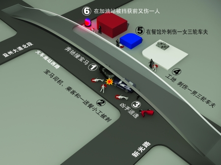 昨日中午12時許,一輛奔馳車和一輛寶馬車在(成都市)火車南站西路追尾。車禍發(fā)生后,奔馳車司機用兇器刺傷寶馬車上兩名女子和一名送餐小工。據知情人士稱,寶馬車上一名女傷者是市內某大型家具城老板的妻子。隨后,奔馳車司機往火車南站方向跑去,一路上,先后刺傷了兩名火三輪司機,最后跑進距現(xiàn)場100多米的加油站,在刺傷一人后,被眾人合力捉住。
