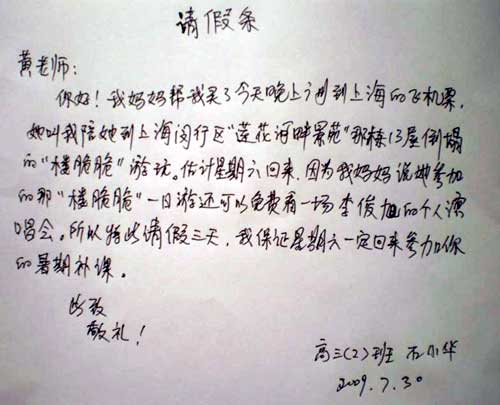 網(wǎng)友發(fā)帖稱:每一年的暑假,有關(guān)教育部門都會三令五申嚴(yán)禁補(bǔ)課,但是各種補(bǔ)課現(xiàn)象卻仍然屢禁不絕,有人強(qiáng)烈反對,也有人表示贊同。然而在廣州,一位女家長為參加某旅行社的“一日游”,竟然讓讀高三正在參加學(xué)校暑期補(bǔ)課的兒子請假,陪同其到上海旅游,該家長的舉動實(shí)在費(fèi)疑所思!這是一張普通的學(xué)生請假條,但內(nèi)容卻讓人大為吃驚!想不到該高中生請假的理由是:“媽媽叫我陪她到上海閔行區(qū)“蓮花河畔景苑”那棟13層倒塌的‘樓脆脆’游玩!闭埣贄l上還說,參加上海“樓脆脆”一日游還可以免費(fèi)看一場李俊旭個人演唱會。一日游還可以看演唱會?難怪這么有吸引力,也不知道這家旅行社怎么會那么牛的!請假條是廣州某高中一位女教師的QQ空間流傳出來的,目前真實(shí)性還不能確定。