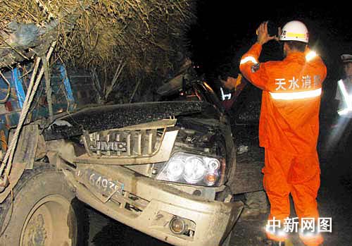 消防官兵到達(dá)現(xiàn)場(chǎng)后,發(fā)現(xiàn)一輛車(chē)號(hào)為川H64935的皮卡車(chē)撞進(jìn)與同向行駛的一輛車(chē)號(hào)為甘E03749載有秸桿的貨車(chē)左側(cè)的后輪胎處,“皮卡”車(chē)身嚴(yán)重?fù)p壞,地面血跡斑斑。車(chē)禍致“皮卡”車(chē)上一人當(dāng)場(chǎng)死亡,“皮卡”內(nèi)另有兩名傷者隨即被先行趕到的120急救車(chē)送往醫(yī)院救治。