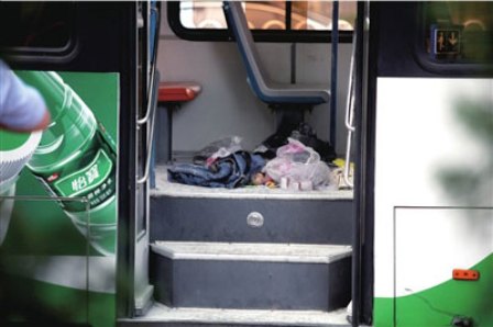 記者看到,公交車前車門處滿是灰色粉末,一條淡藍(lán)色牛仔褲、一袋蘋果和一些塑料袋堆在車門附近。附近居民猜測(cè),那里正是嫌疑人意圖縱火的位置,“警察一直在那附近拍照,那些東西可能也是救火時(shí)留下的!