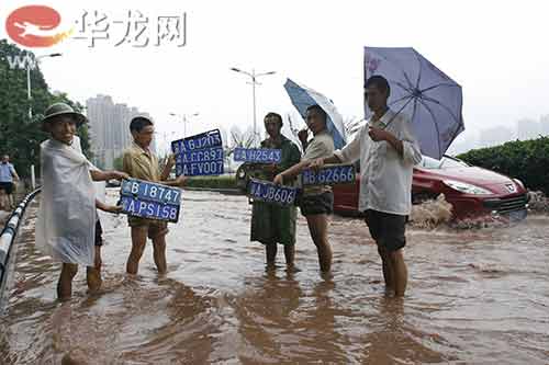 撿到車牌的這位中年男子姓李,是一位“力哥”。李先生告訴記者,4日下午該路段的積水達1—2米深,不少小車在經過積水時,車牌都掉進了水里!拔覐南挛6點等到晚上12點過,今天早上一早又來了,我總共撈到6、7塊車牌”,李先生說,車主只需要付給他100塊錢的勞務費,他就將車牌交還車主。