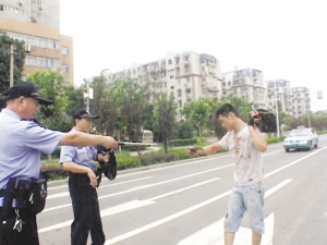 該男子出現之后,很快在附近人行橫道上就圍滿了群眾,大家都遠遠地站著,紛紛議論起來。“不會是在拍電影吧?也沒有看到攝像機啊?”就在周圍群眾七嘴八舌地議論著的時候,幾輛警車呼嘯而至。