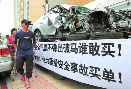 昨日上午,很多途經(jīng)市中心的市民都目睹了一支稀奇的隊(duì)伍:尼桑開道,拖車尾隨。拖車上躺著一輛銀色寶馬,車頭右側(cè)受損嚴(yán)重,右前車門扭曲,兩個(gè)前胎都脫離車體。拖車的三面拉著白底黑字的橫幅,上書“寶馬自然爆胎安全氣囊不彈出 破馬誰敢買!誰為消費(fèi)者維權(quán)!誰為質(zhì)量安全事故買單!”等字樣。