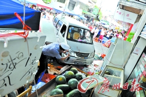 昨日下午1時30分,禪城平桂街的麗晶市場,一輛面包車發(fā)瘋似的沖進一個水果店,將路過此處的鄧松香老人撞飛幾米外,制衣廠女工阿玲則被碾在車下,面包車撞翻水果店,頂翻三臺冰柜,將老板娘胡金水從躺椅上撞下來。