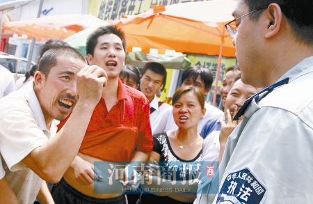 這時又沖來一中年男子,與執(zhí)法隊員撕扯起來,場面一片混亂。一攤販告訴記者,這人是朱林的丈夫,姓許,信陽固始人,兄妹八人都在附近做生意。這一帶賣水果的都是信陽老鄉(xiāng),來鄭做生意已有十多年。