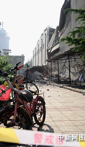 據(jù)在現(xiàn)場維持秩序的裕華區(qū)政府工作人員介紹,由于要拆遷的河北賓館與住宅樓距離太近,因此無法實行爆破拆除,只有動用大型機械勾機等按部就班地進行拆除。12日上午,河北賓館南側墻體在拆除時,砸落的水泥塊將放置于墻根下的數(shù)輛自行車、電動車砸壞,幸未造成人員傷亡。