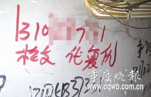 前日上午,記者在彭水縣文化館一居民帶領(lǐng)下,來(lái)到該館二樓轉(zhuǎn)彎處,墻上滿(mǎn)是“辦證”、“貸款”等牛皮癬,其中有兩塊內(nèi)容最雷人:“131072×××××,迷藥、槍支”、“131072×××××,槍支、代復(fù)仇”(右圖)。