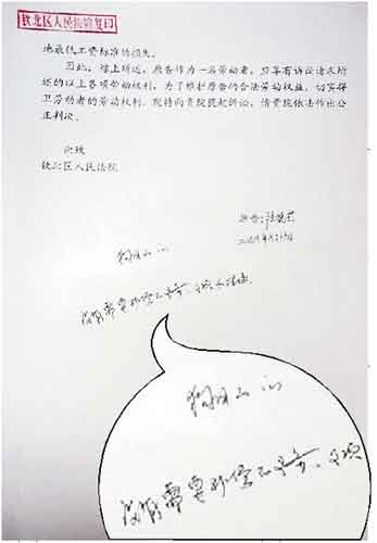 去年12月8日,李先生到法院查閱案件材料時(shí),在一份起訴狀的末頁,看到有人在空白處寫下了兩行文字。上一行寫著“狗日的”字樣,下一行則寫著“沒有需要補(bǔ)償?shù)牧x務(wù)、事項(xiàng)和理由”字樣(見左圖)。夫妻倆認(rèn)為,有人誤導(dǎo)和左右了此次判案。