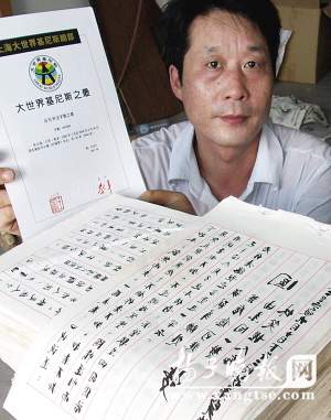 高淳縣椏溪鎮(zhèn)荊山村農(nóng)民張正福,利用6年時間反字倒抄紅樓夢全集,共120回,86萬字,并順利獲得大世界基尼斯之最證書(如左圖)。為了給附近村民修建一條長約一千米的水泥路,他決定將這些手抄本賣給有收藏條件的愛好者。