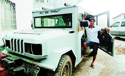 “我是今年4月份開始造這輛車的。”去年楊倫偉買來一輛二手越野車開,車子老是出問題,他便有了自己造一輛車的大膽想法。他從網(wǎng)上下載“悍馬”圖片,一邊研究一邊創(chuàng)新。設(shè)計(jì)圖出來了,他拆卸了一輛進(jìn)口三菱車的底盤,買來配件,自己搭造骨架、焊接外殼,他還特地跑到車輛修理廠“偷師學(xué)藝”,終于造出“悍馬”。