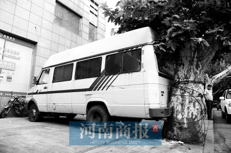 在鄭州市經(jīng)六路與緯三路交叉口附近,這輛白色依維柯車牌號為豫A69026,車頭朝東,距臨街建筑的墻壁大約有一米,車頭與墻之間被人“塞進”了一輛三輪車。車尾朝西,緊緊貼住人行道邊的一棵樹。車身擺得很正,剛好把人行道堵死。