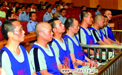 昨日,涉案15名被告人和1家被告單位在東莞中級(jí)人民法院過(guò)堂受審(如圖,蘇仕日攝)。公訴機(jī)關(guān)認(rèn)為應(yīng)以銷售偽劣產(chǎn)品罪追究其刑事責(zé)任。公訴人花了40分鐘才讀完近萬(wàn)字的起訴狀,狀中列舉了26宗假煙販賣指控。