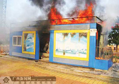 當(dāng)日下午5時15分,欽州消防官兵趕到現(xiàn)場時,看到整個環(huán)保公廁被熊熊大火包裹,現(xiàn)場散發(fā)出很大的燃氣氣味,一名剛從火場逃出的市民被大面積燒傷,在等待救治。消防人員很快斷定,火災(zāi)是地下管道天燃氣泄漏所致,隨即一隊人馬撲救、尋找泄漏點,另一隊警戒現(xiàn)場、疏散附近居民。