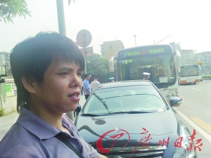 記者在上午10時許趕到事故現(xiàn)場。在先烈中路小學門前,停著一輛車牌號為“粵A 59743”的862路公交車,旁邊停著一輛簇新的天籟轎車,臨時車牌“粵AD5460”被放在駕駛臺上。據(jù)悉,這輛天籟轎車才“下地”3天。記者在現(xiàn)場看到,天籟轎車左側(cè)后門被刮傷,原本的亮黑色有五分之一被刮花,兩名司機正分別接受警察的訊問。20多歲的公交車司機嚴尚海左眼紅腫,左邊臉也腫起一塊,額頭傷口滲血,上下嘴唇均破裂流血,上衣血跡斑斑。30來歲的轎車司機鄭某則一臉茫然地站著,臉上未見傷痕,淺色上衣也沾有血跡。