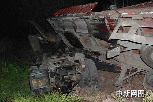 4時15分,消防隊員趕到事發(fā)路段,只見大掛車正翻倒在路旁,由于側(cè)翻時車體與地面產(chǎn)生摩擦非常大,掛車車頭嚴重變形,滿載的鋼筋及車體碎片散落一地,事故現(xiàn)場能清晰的看到一條磨擦印。此時,副駕座上的一男子整個身體都已被甩出駕駛室外,但是該男子頭部卻被卡在右側(cè)車窗處,經(jīng)現(xiàn)場救護醫(yī)生判斷該名人員已沒有了生命體征,已經(jīng)死亡。