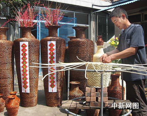 中新網(wǎng)臨沂9月10日電(記者 周秀光 通訊員 周寶云)“三十年華夏改革風(fēng)起云涌,六十載祖國發(fā)展日新月異”。走進(jìn)山東省郯城縣廟山鎮(zhèn)薛莊三村村民呂士明家的庭院,四個(gè)碩大的柳編“寶瓶”一字排開,將小小庭院擠得滿滿當(dāng)當(dāng)。指著寶瓶上的對(duì)聯(lián),“寶瓶”編織者呂士明充滿自豪的說,新中國成立六十周年,俺也得獻(xiàn)上一份賀禮。