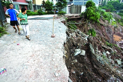 9月11日晚9:30,石小路64號附1號樓住戶邱國華聽到一聲巨響,抬眼一看,小區(qū)后方的邊坡及圍墻瞬間化為烏有,所幸沒有人員傷亡。昨日6時(shí),記者到達(dá)事發(fā)現(xiàn)場,民警已將現(xiàn)場封鎖,記者看見38米長的邊坡已經(jīng)殘破不堪,邊坡的水泥地面已生出裂痕,坍塌面上也有幾道細(xì)長的裂縫蔓延在10米多高的殘面上,坍塌的泥土磚石小山般堆積在小區(qū)邊的施工工地,半扇小區(qū)鐵門倒在地面,一根黑色管道裸露著,居民告訴記者,這根管道是天然氣管。