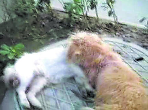 李微漪將母狗放在窨井蓋上,黃狗圍繞在母狗的身邊,不停地用雙腳刨著母狗,他斜著頭,頭部依偎著母狗的頸部。